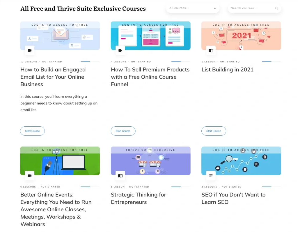With the Thrive Suite, it’s also included access to the Thrive University, where you’ll be able to join courses (created with Thrive Apprentice of course), about different marketing topics, like SEO, online events, funnels, list building…